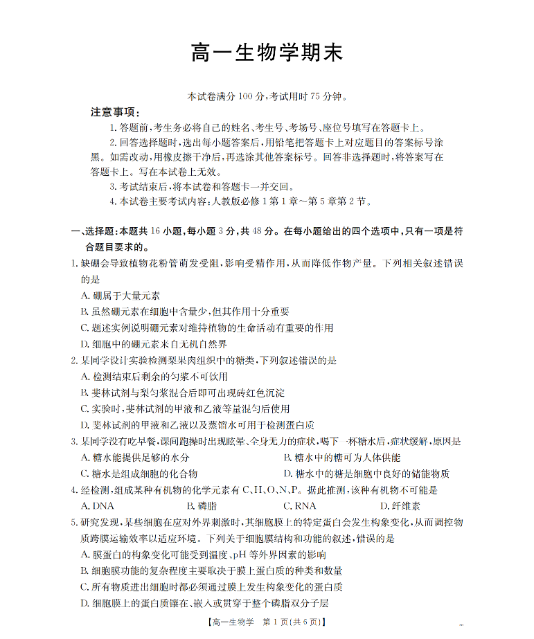 甘肃省定西地区2025-2026学年(上)高一期末考试 生物.pdf