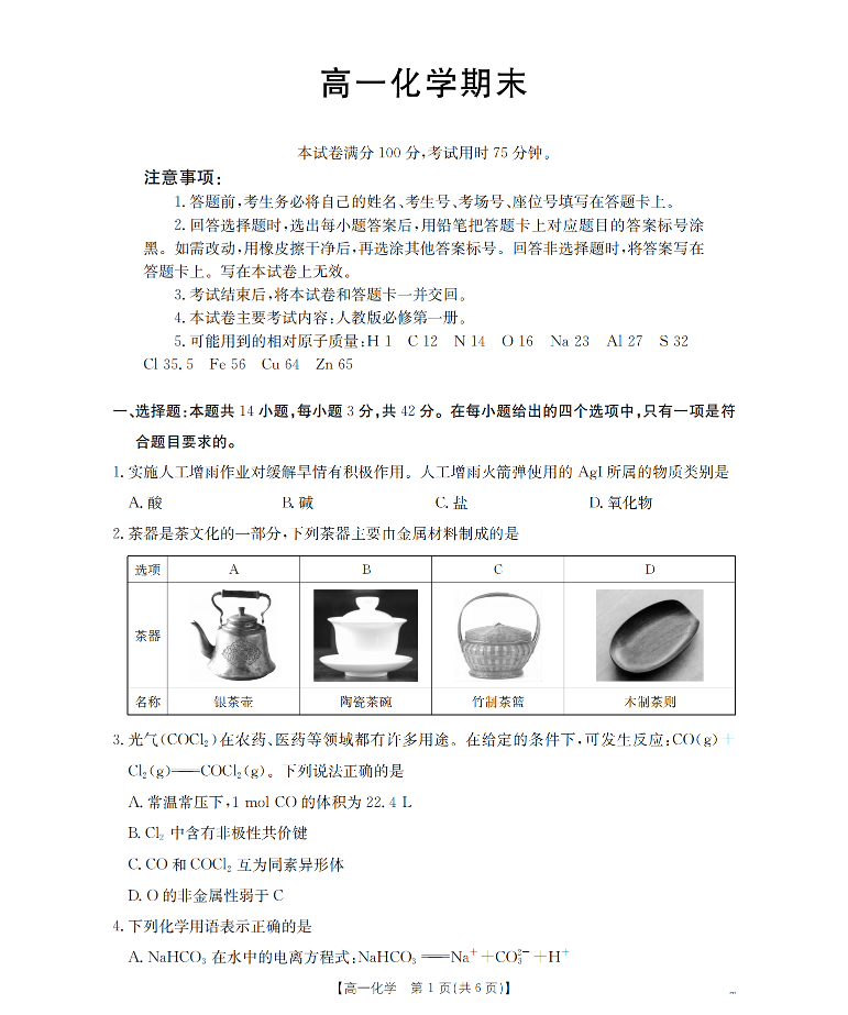 甘肃省定西地区2025-2026学年(上)高一期末考试 化学.pdf