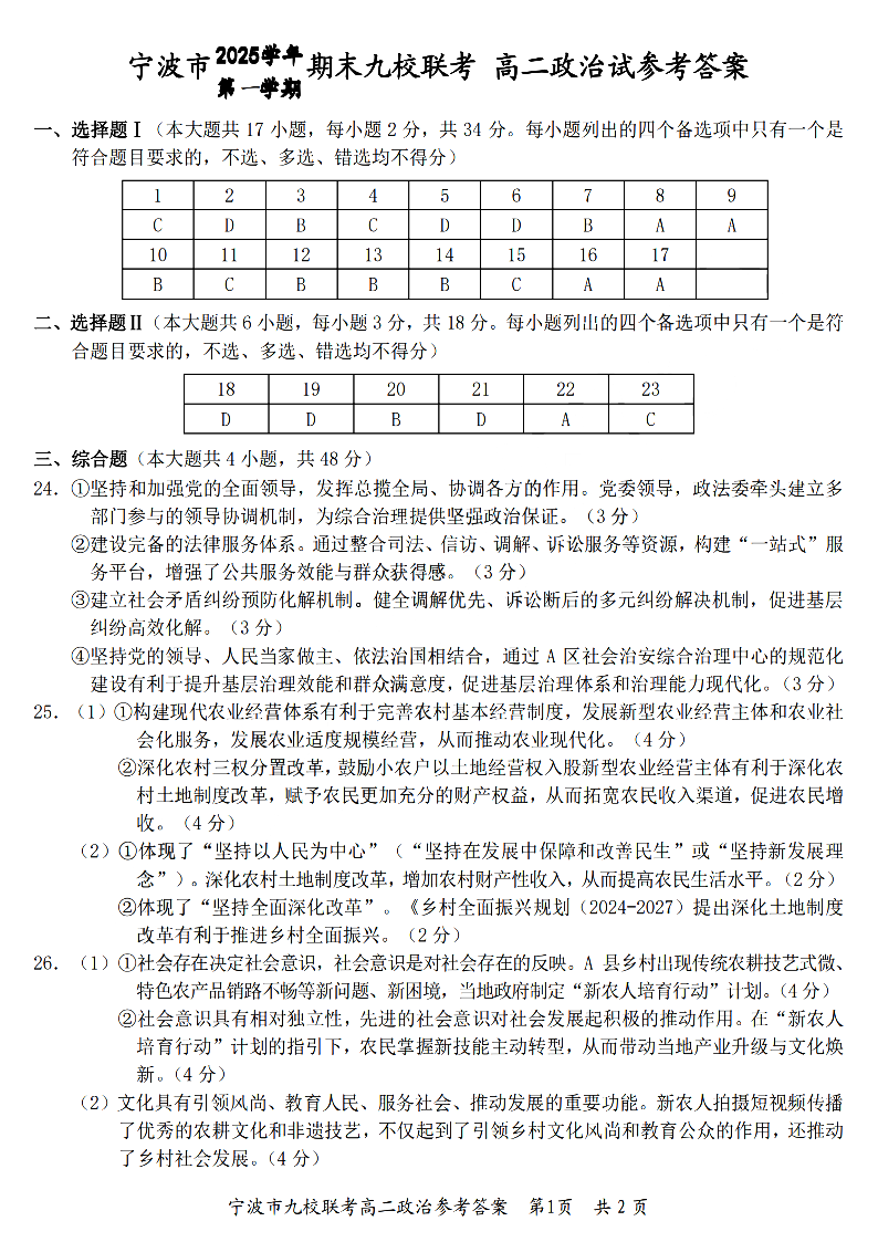 浙江省宁波九校联盟2025学年高二第一学期期末联考 政治答案.pdf