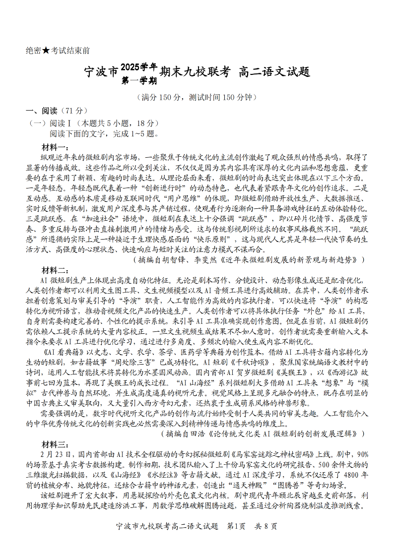 浙江省宁波九校联盟2025学年高二第一学期期末联考 语文.pdf