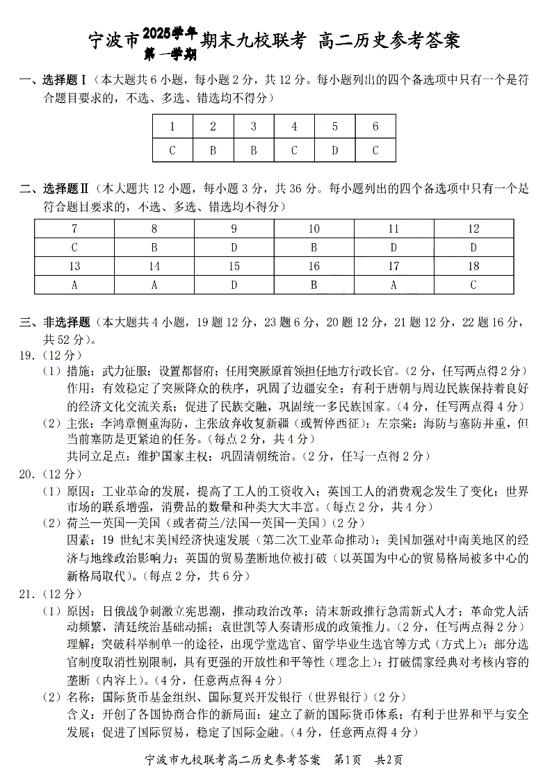 浙江省宁波九校联盟2025学年高二第一学期期末联考 历史答案.pdf