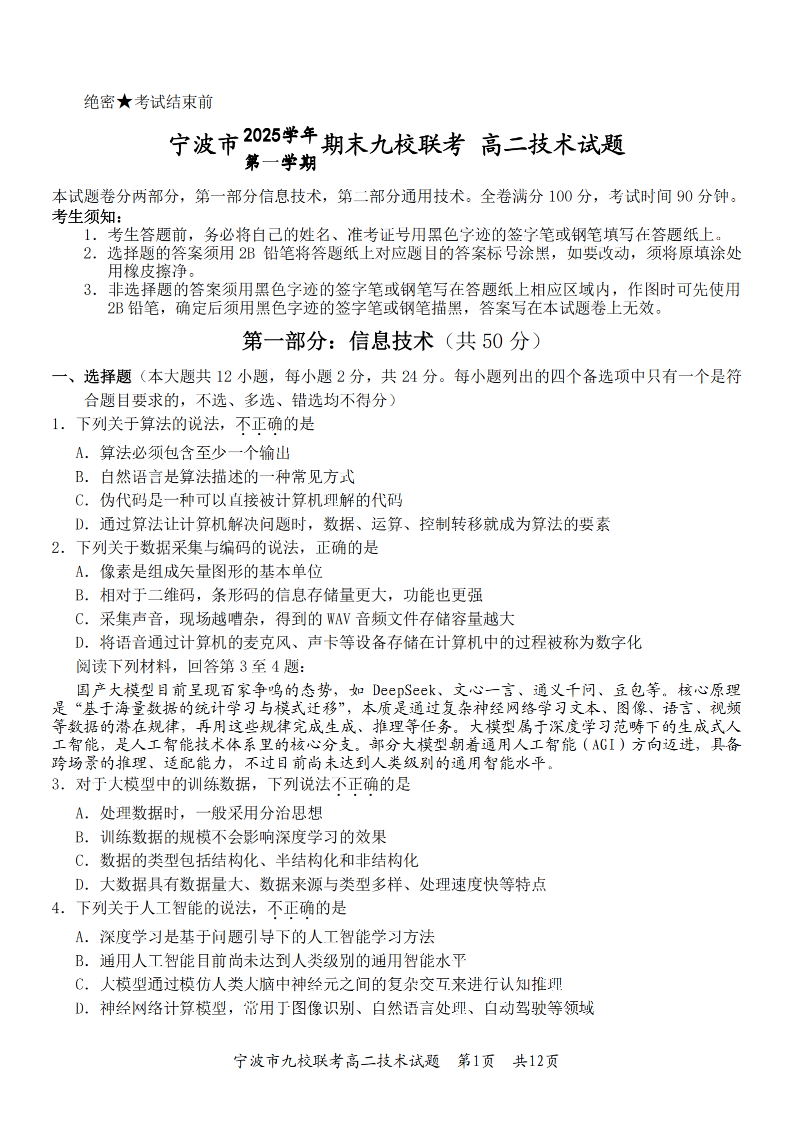 浙江省宁波九校联盟2025学年高二第一学期期末联考 技术.pdf
