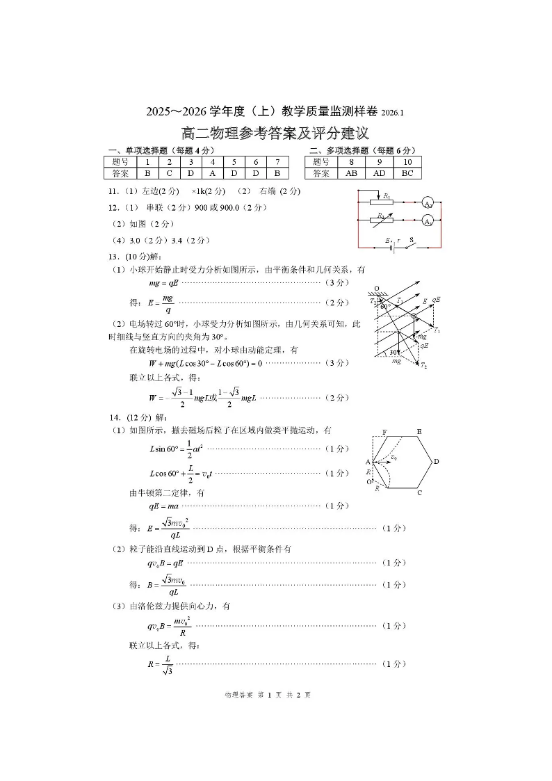 攀枝花市2025-2026学年度高二(上)教学质量监测样卷 物理答案.pdf
