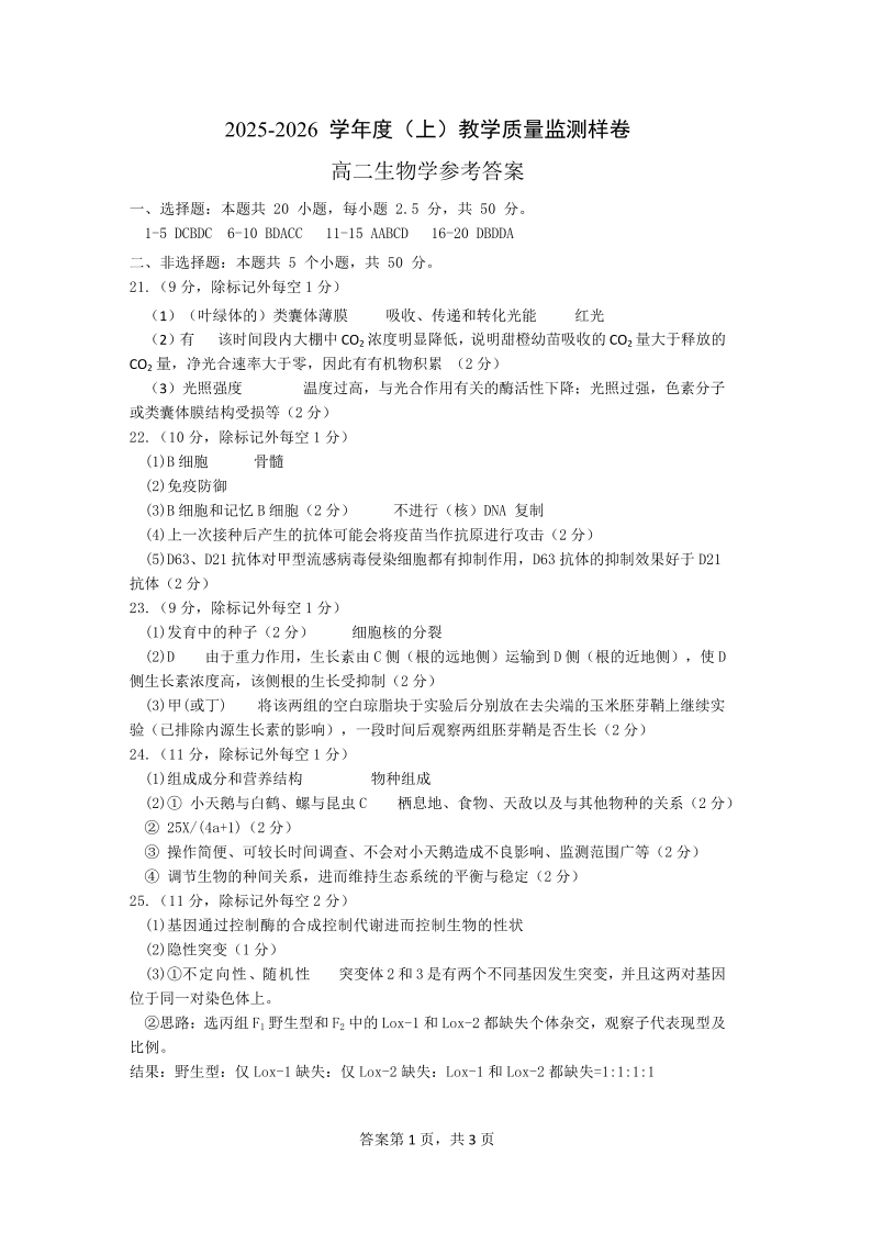 攀枝花市2025-2026学年度高二(上)教学质量监测样卷 生物答案.pdf