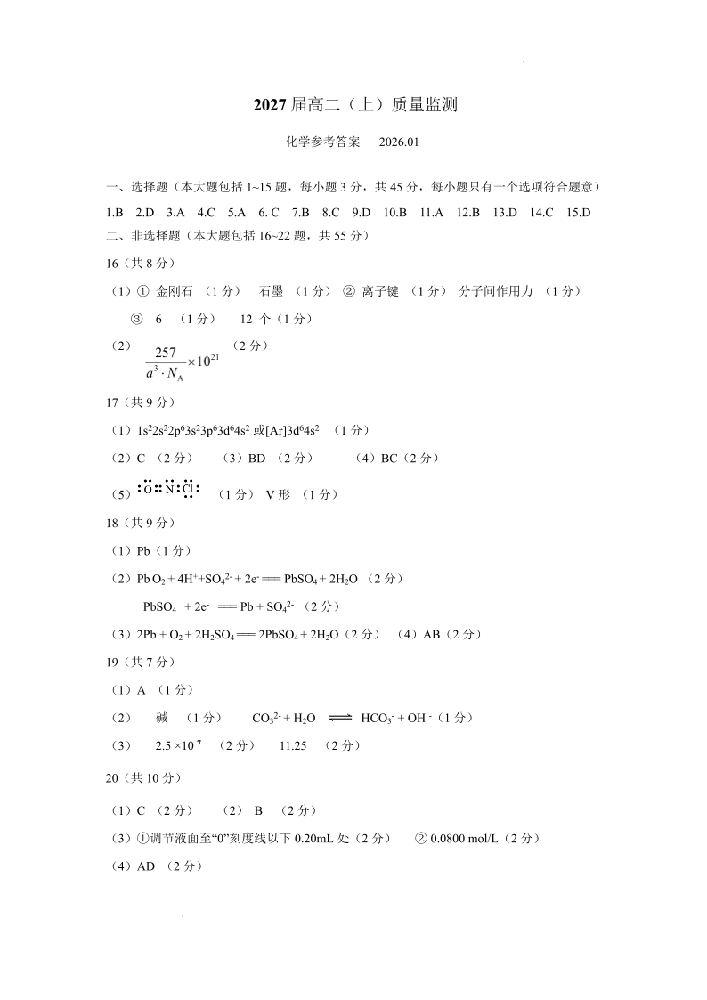 攀枝花市2025-2026学年度高二(上)教学质量监测样卷 化学答案.pdf