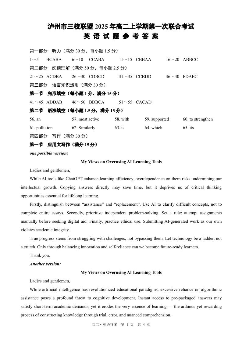 四川省泸州市三校联盟2025-2026学年高二上学期第一次联合考试 英语答案.pdf