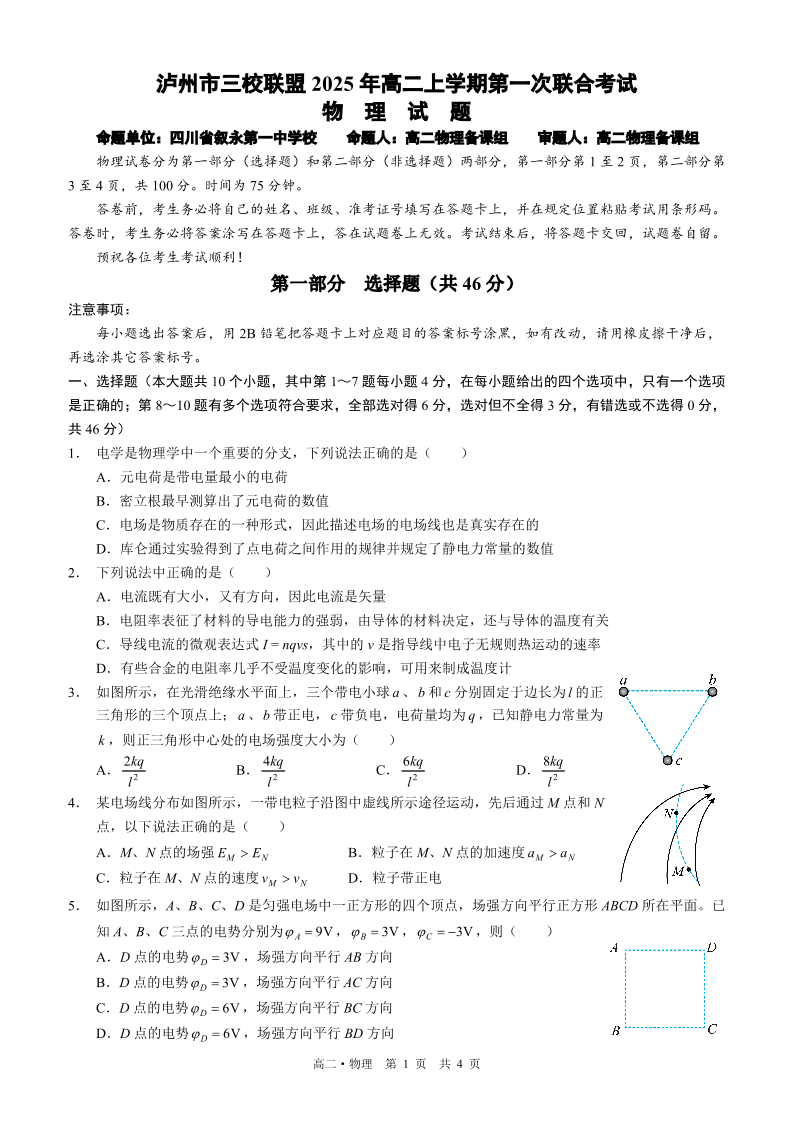 四川省泸州市三校联盟2025-2026学年高二上学期第一次联合考试 物理.pdf