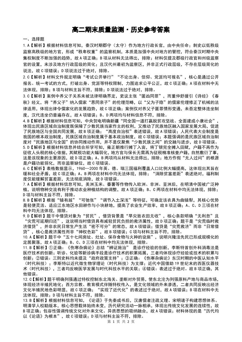 辽宁省点石联考2025-2026学年高二1月期末质量监测 历史(B版)答案.pdf