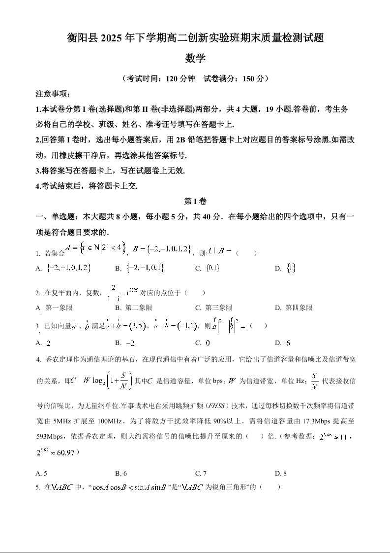 湖南省衡阳市衡阳县2025-2026学年高二期末质量检测 数学试题(含答案).docx