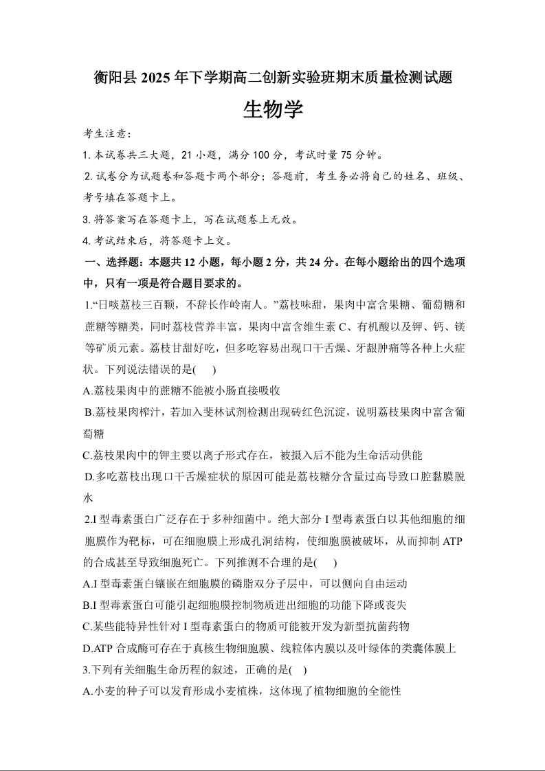 湖南省衡阳市衡阳县2025-2026学年高二期末质量检测 生物试题(含答案).docx