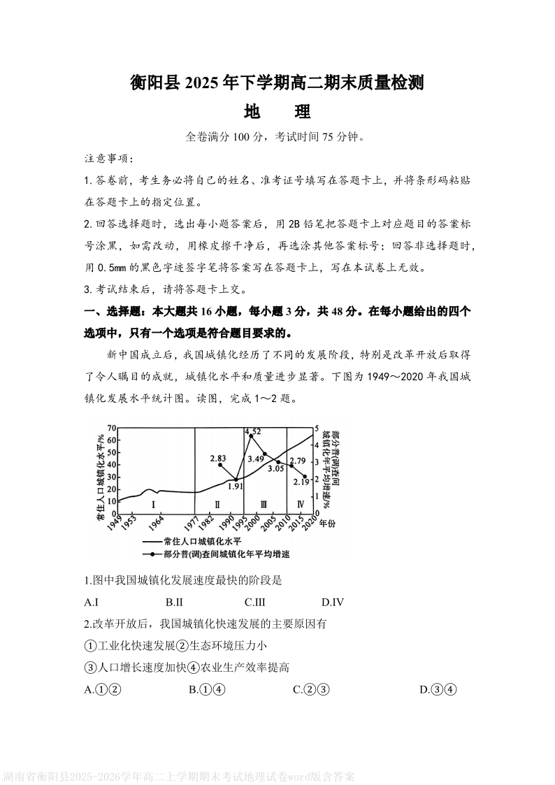 湖南省衡阳市衡阳县2025-2026学年高二期末质量检测 地理试题(含答案).pdf