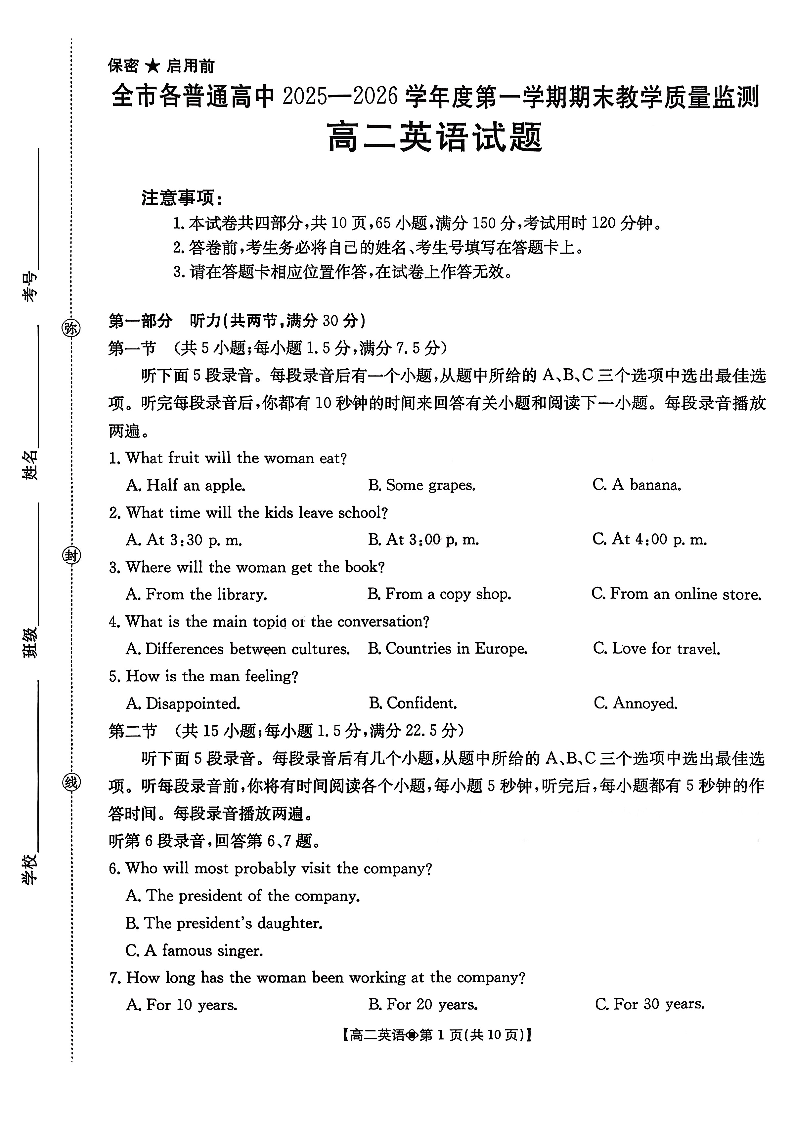 贵州省安顺市2025-2026年高二上学期1月期末考试 英语试题(含答案).pdf