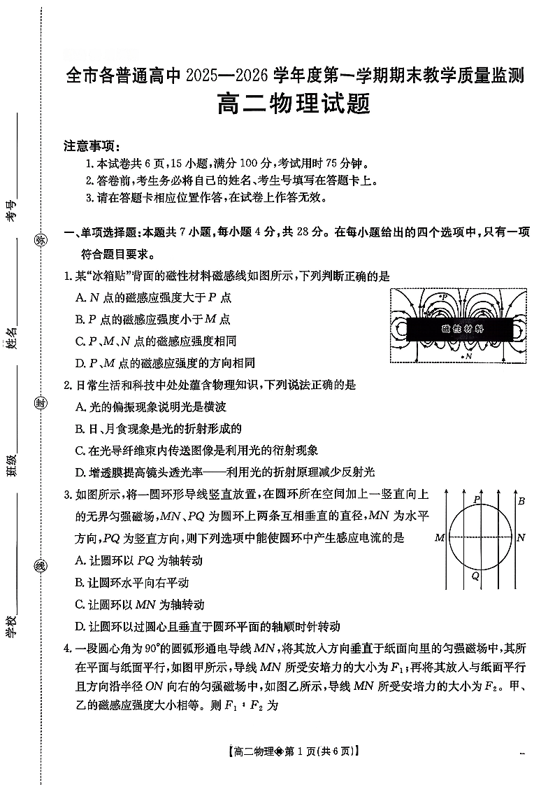 贵州省安顺市2025-2026年高二上学期1月期末考试 物理试题(含答案).pdf