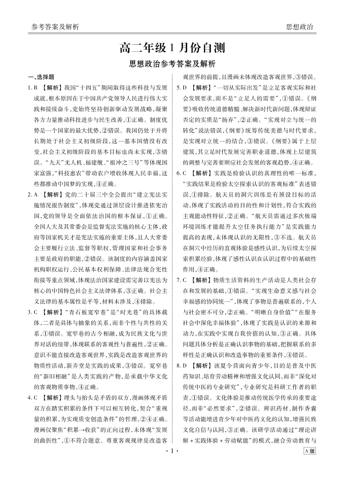 高二年级1月份自测政治答案A版.pdf