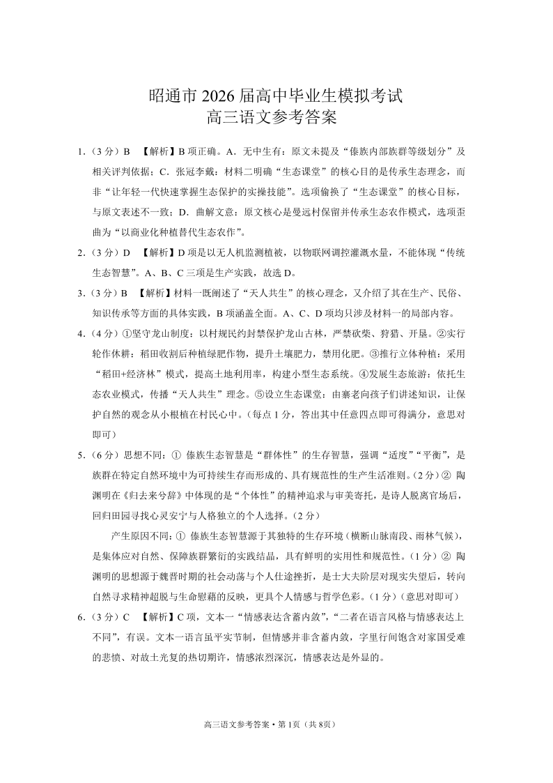 云南省昭通市2026届高中毕业生模拟考试 语文答案.pdf