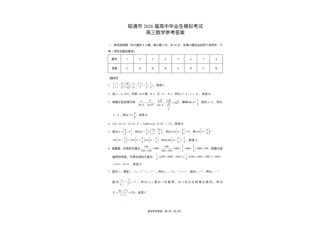 云南省昭通市2026届高中毕业生模拟考试 数学答案.pdf