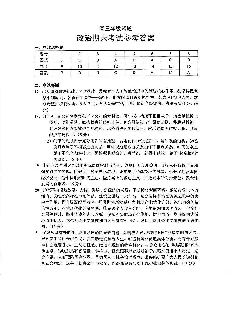 江苏省无锡市2025年秋学期高三期终教学质量调研测试 政治答案.pdf