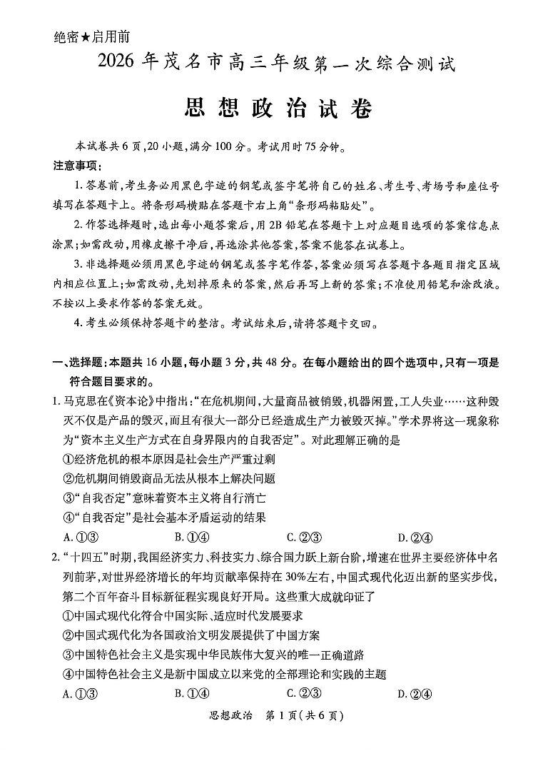 2026年茂名市高三年级第一次综合测试 政治.pdf