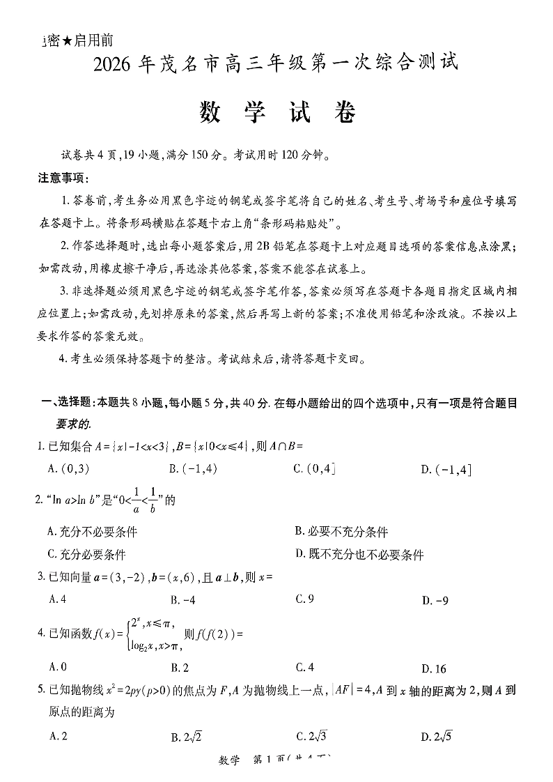 2026年茂名市高三年级第一次综合测试 数学.pdf