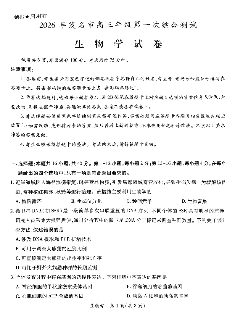 2026年茂名市高三年级第一次综合测试 生物.pdf