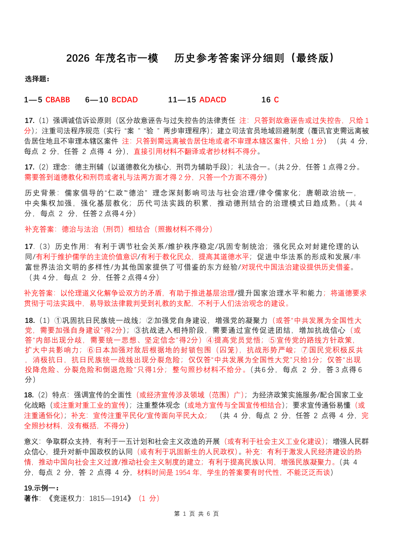 2026年茂名市高三年级第一次综合测试 历史答案.pdf