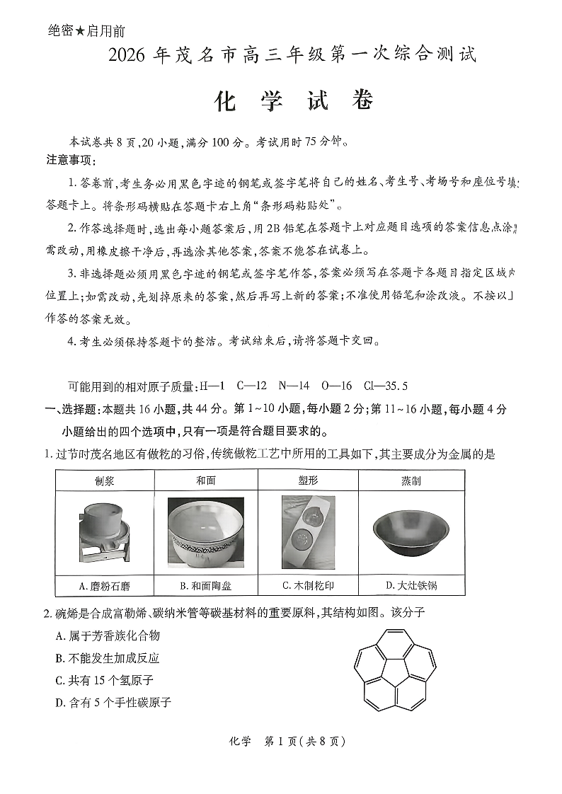 2026年茂名市高三年级第一次综合测试 化学.pdf