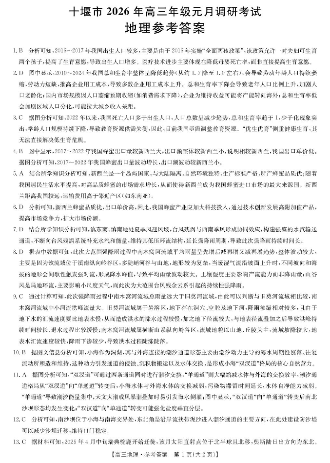 十堰市2026年高三年级元月调研考试 地理答案.pdf