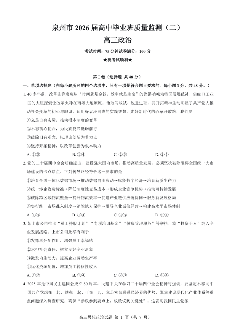 福建省泉州市2026届高中毕业班质量监测(二)政治.docx