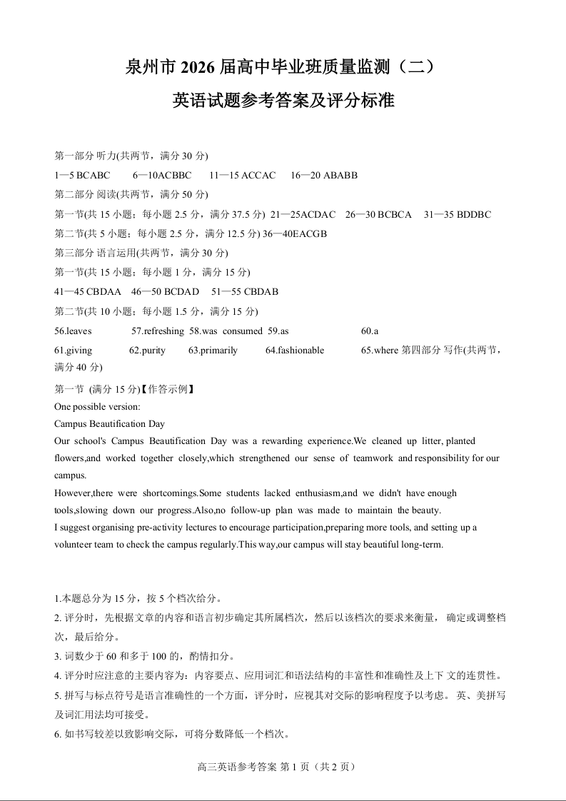 福建省泉州市2026届高中毕业班质量监测(二)英语答案.docx