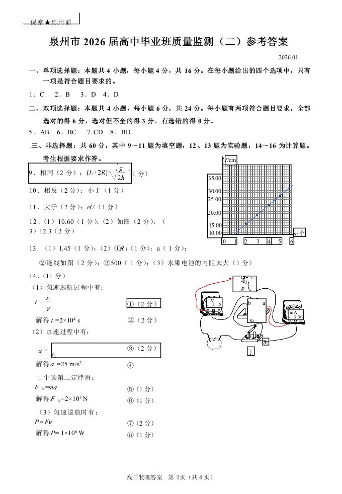 福建省泉州市2026届高中毕业班质量监测(二)物理答案.docx