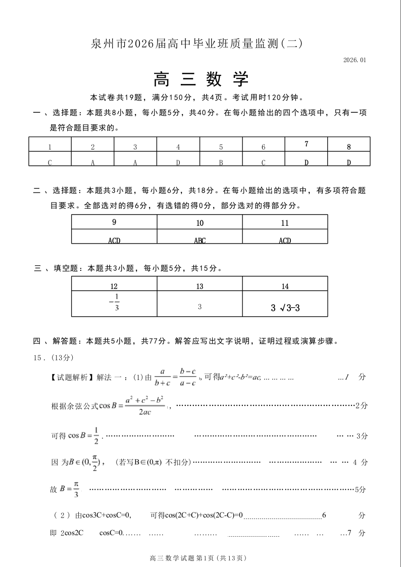 福建省泉州市2026届高中毕业班质量监测(二)数学答案.docx