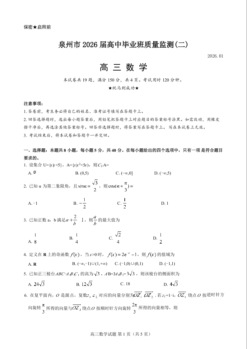 福建省泉州市2026届高中毕业班质量监测(二)数学.docx