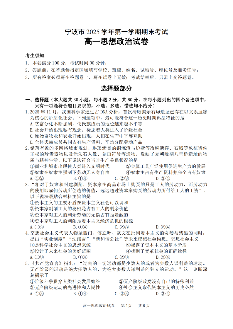 浙江省宁波市2025学年高一第一学期期末测试 政治.pdf