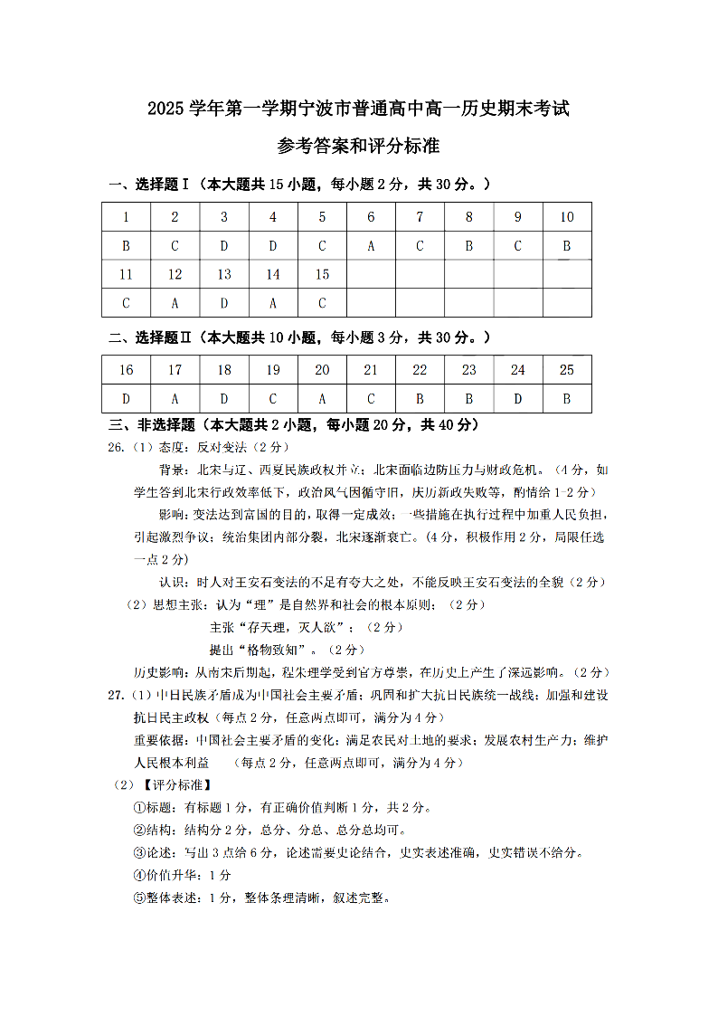 浙江省宁波市2025学年高一第一学期期末测试 历史答案.pdf
