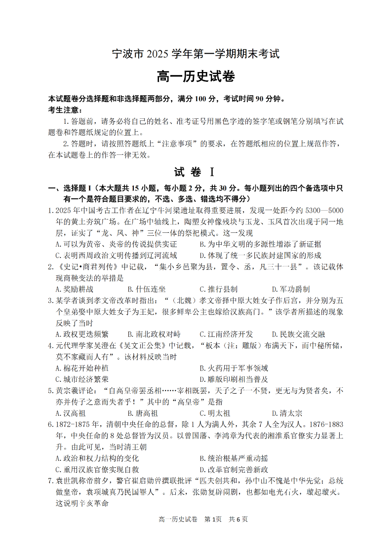 浙江省宁波市2025学年高一第一学期期末测试 历史.pdf