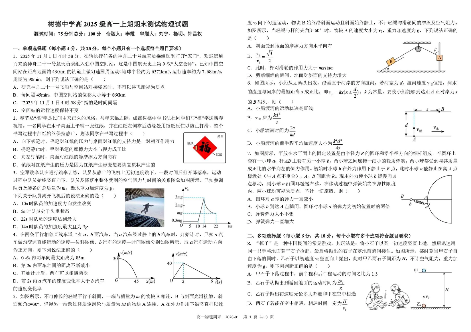 四川省成都市树德中学高2025级高一年级上期期末测试 物理试题(含答案).pdf