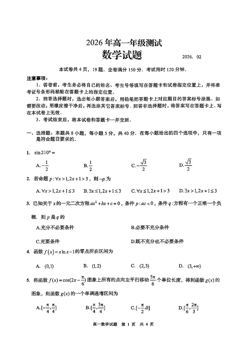 山东省青岛市2026年高一年级上学期2月期末测试 数学.pdf