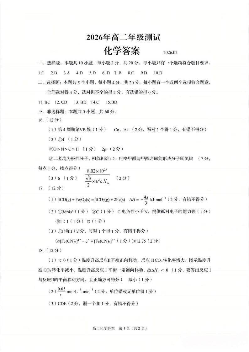 山东省青岛市2026年高二年级上学期2月期末测试 化学答案.pdf