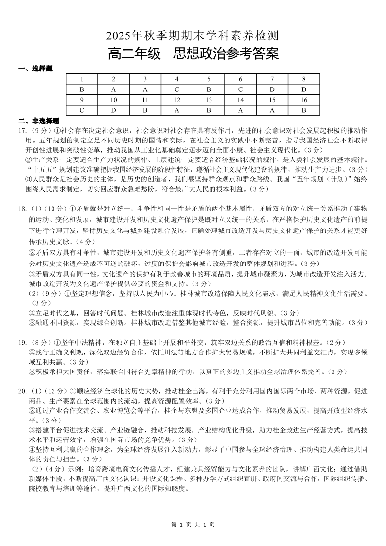 贵港市202年秋季学期高二年级期末学科素养检测 政治答案.pdf