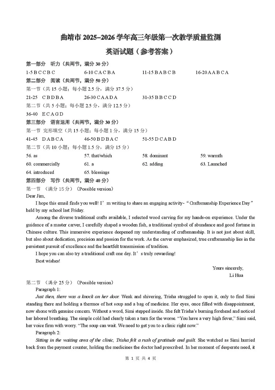曲靖市2025-2026学年高三年级第一次教学质量监测 英语答案.pdf