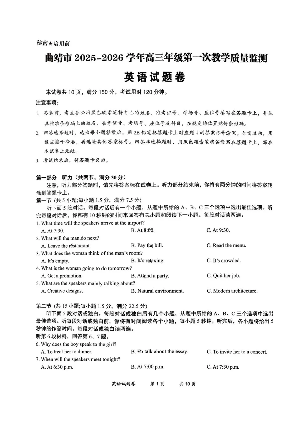 曲靖市2025-2026学年高三年级第一次教学质量监测 英语.pdf