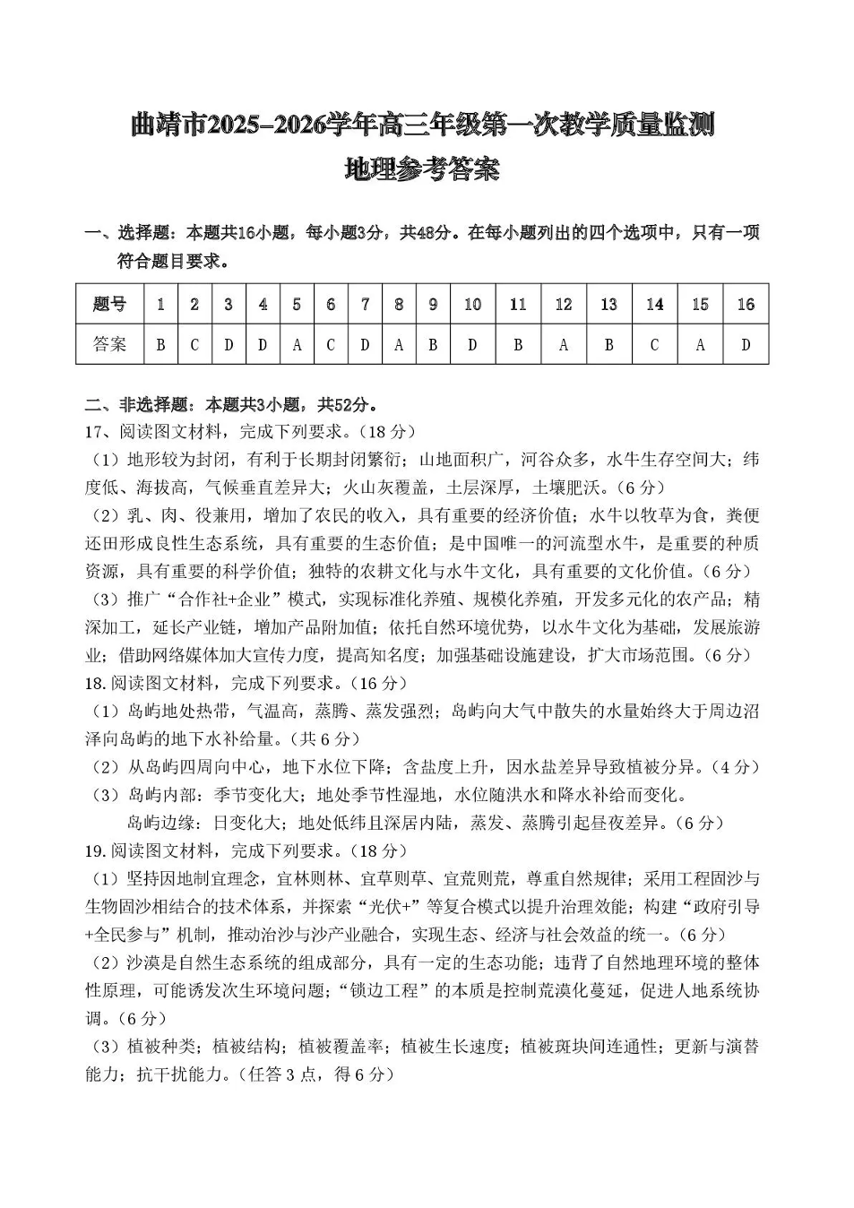曲靖市2025-2026学年高三年级第一次教学质量监测 地理答案.pdf