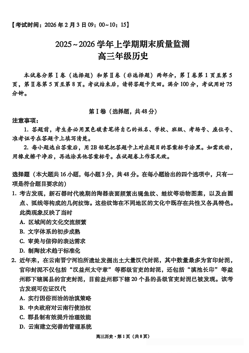 保山市2025~2026学年高三上学期期末质量监测 历史试题(含答案).pdf