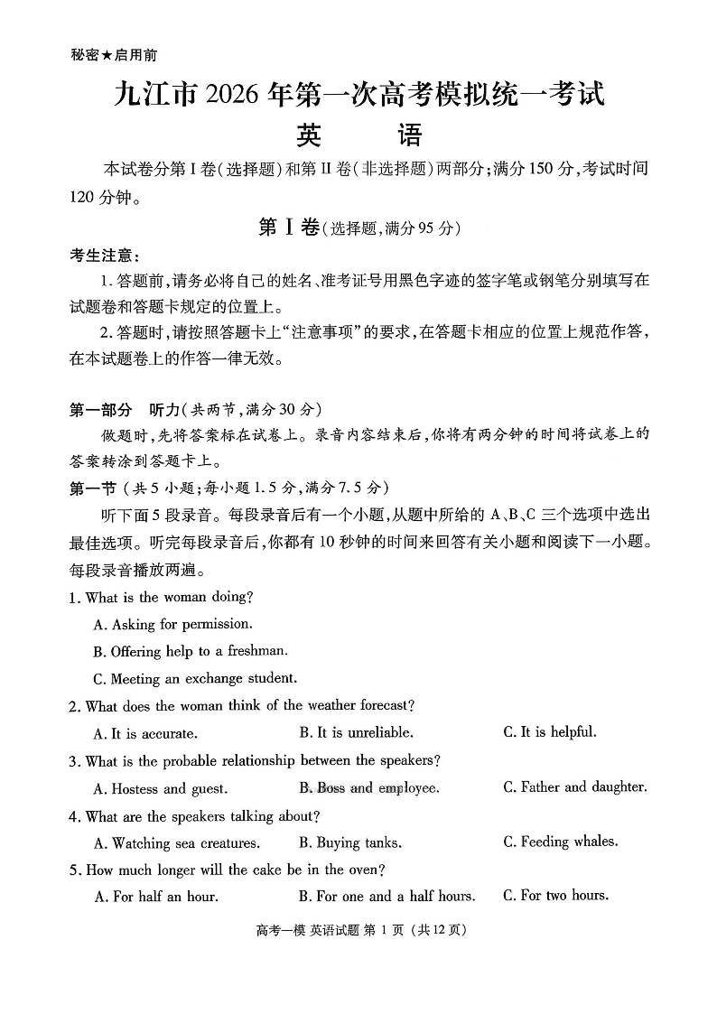 江西省九江市2026年第一次高考模拟统一考试 英语.pdf