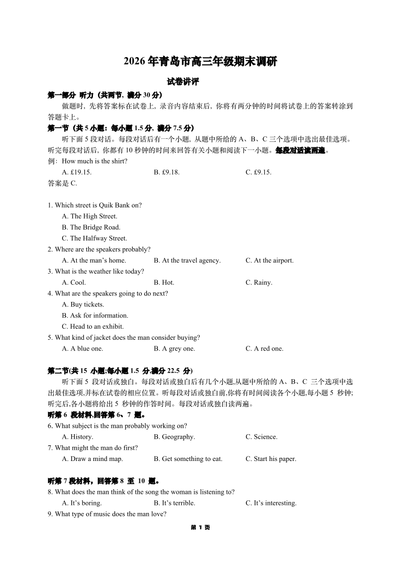 山东省青岛市2026届高三第一学期期末学业水平检测 英语.pdf