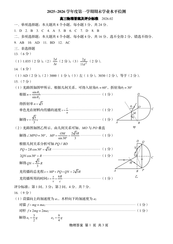 山东省青岛市2026届高三第一学期期末学业水平检测 物理参考答案.pdf
