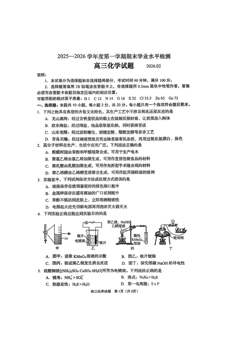 山东省青岛市2026届高三第一学期期末学业水平检测 化学.pdf