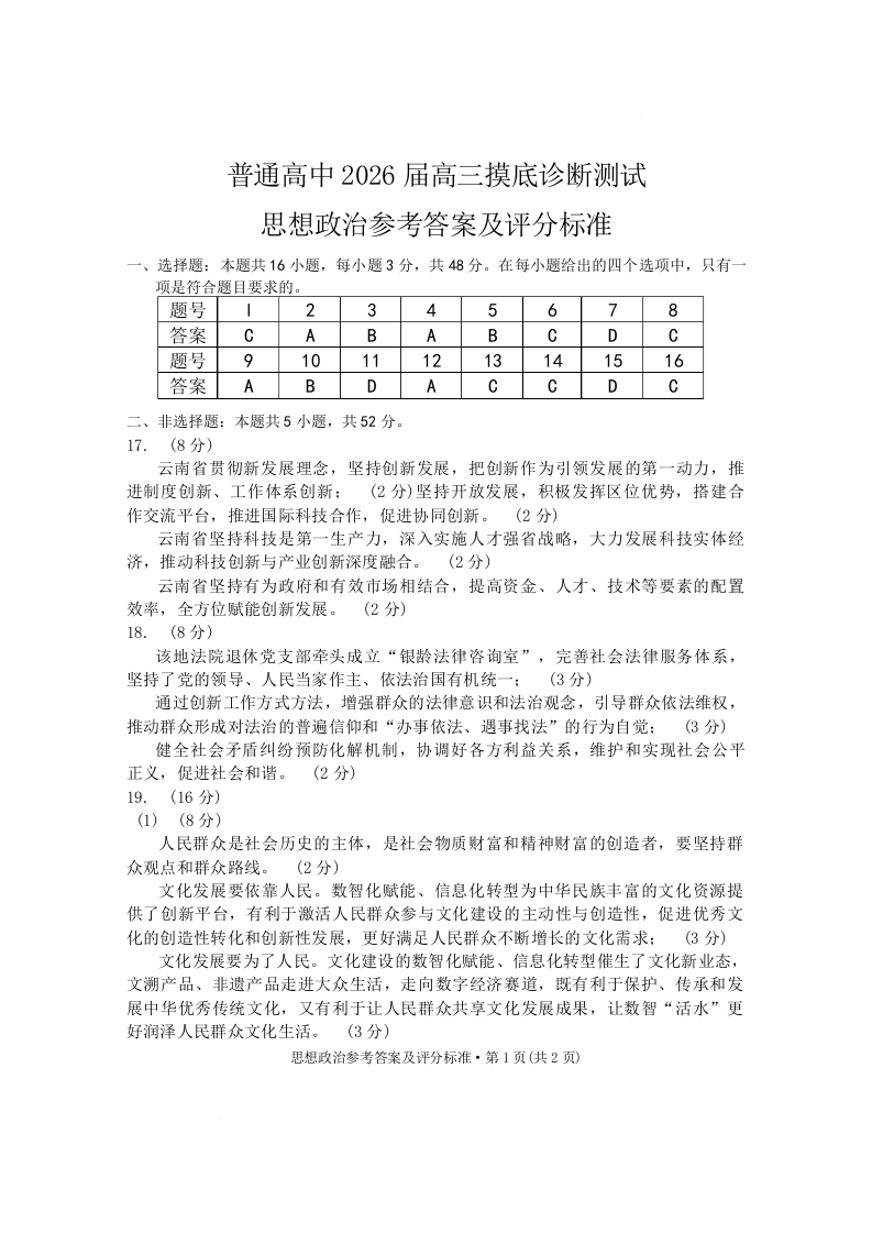 云南省昆明市普通高中2026届高三摸底诊断测试 政治答案.docx