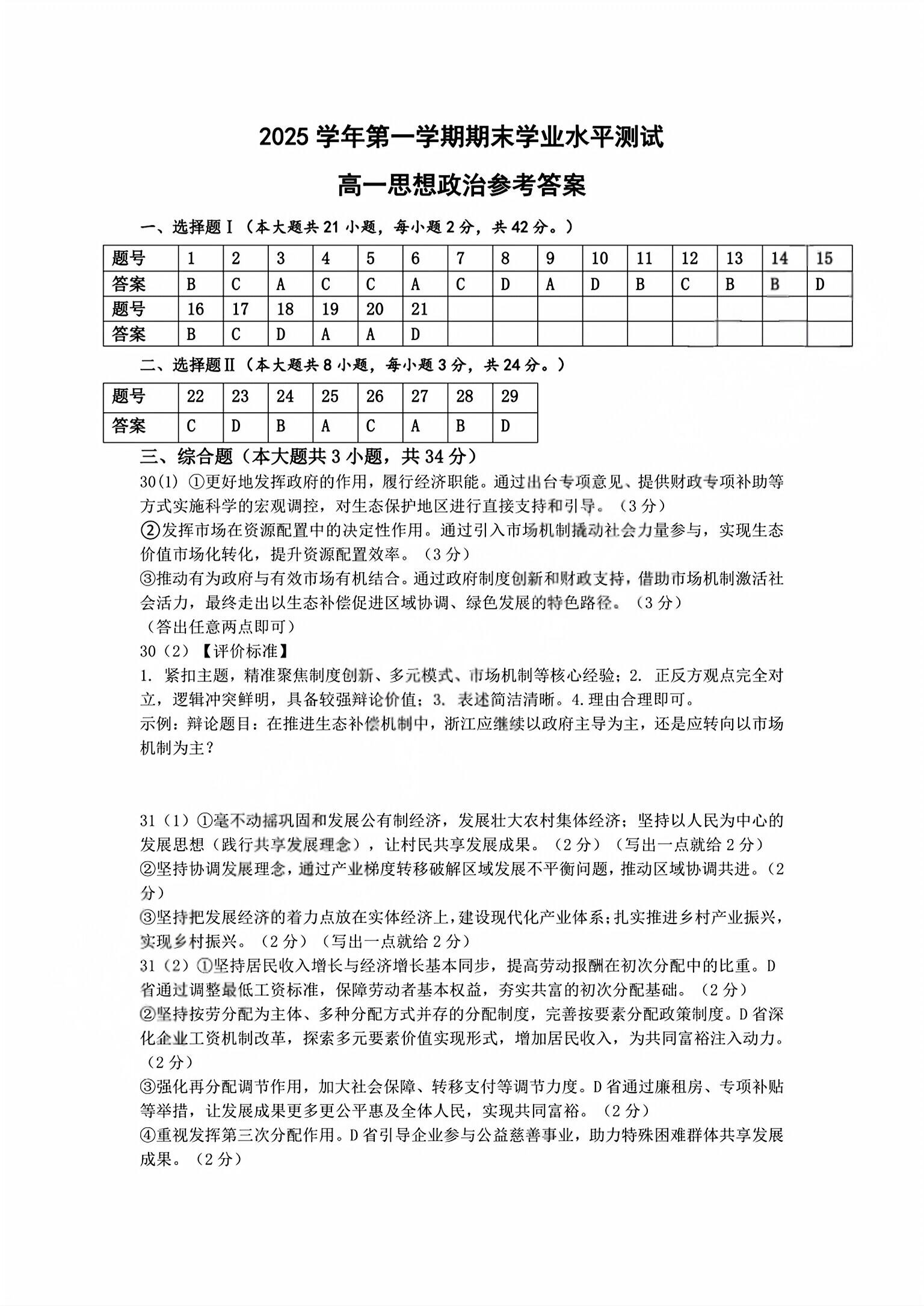 浙江省杭州市2025学年第一学期高一年级期末学业水平测试 政治答案.pdf