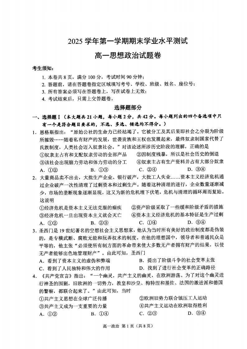 浙江省杭州市2025学年第一学期高一年级期末学业水平测试 政治.pdf